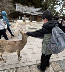 鹿と戯れているようです。服や持ち物を食べられないようにしてくださいね(笑)